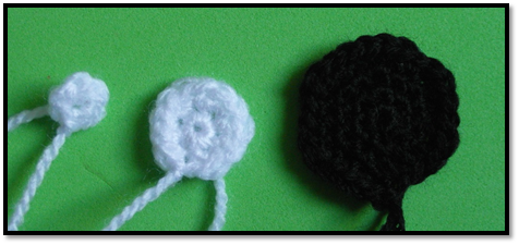 La manera más sencilla de tejer una media luna es hacer un círculo y doblarlo a la mitad. ![]() Así pues, vamos a tejer un círculo del tamaño que más nos interese, por ejemplo: En blanco 1. Anillo de 6 pb, 2. Aum en todos los puntos (12). 3. “1 pb, aum”, repetir hasta el final de la vuelta (18). 4. “2 pb, aum”, repetir (24). 5. “3 pb, aum”, repetir (30). En negro haremos la pupila con un Anillo de 6 pb.